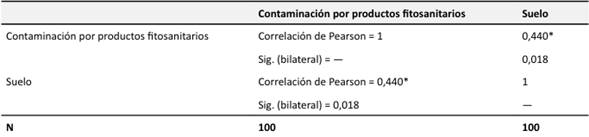 En la Tabla 6, se presentan los resultados del análisis de correlación, en el cual se obtuvo un coeficiente de Pearson (R = 0,440*), evidenciando una correlación positiva de magnitud moderada (p = 0,018; p < 0,05). Este resultado indicó que la contaminación por productos fitosanitarios tuvo una relación significativa con el suelo, lo que sugiere que su uso influyó directamente en la calidad y composición del sustrato agrícola.