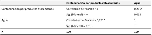 En la Tabla 7, se presentan los resultados del análisis de correlación, donde se obtuvo un coeficiente de Pearson (R = 0,281*), indicando una relación positiva y significativa (p = 0,018; p < 0,05), aunque de baja intensidad. Estos resultados sugieren que la contaminación por productos fitosanitarios tuvo un impacto en la calidad del agua, aunque en menor medida que en otras variables como el suelo o el medio ambiente.