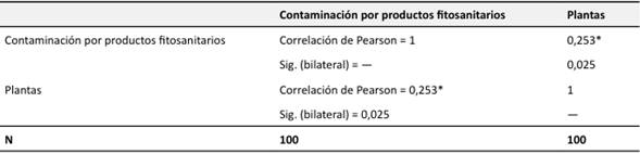 En la Tabla 8, se presentan los resultados del análisis de correlación, donde se obtuvo un coeficiente de Pearson de R = 0,253*, con un nivel de significancia de p = 0,025 (p < 0,05). Este resultado indicó una correlación positiva y significativa entre la contaminación por productos fitosanitarios y las plantas, aunque de baja magnitud.