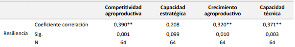 Por la falta de actitud de afrontamiento y adaptación de los caficultores para que asuman riesgos y tomar decisiones estratégicas se descubrió una correlación positiva moderada muy significativa entre la variable competitividad agroproductiva con la variable resiliencia; y de igual manera de la variable resiliencia con las dimensiones crecimiento agroproductivo y capacidad técnica. En otras palabras, una deficiente o sobresaliente resiliencia en los caficultores del centro poblado Cayumba influye en una deficiente o sobresaliente competitividad agroproductiva.