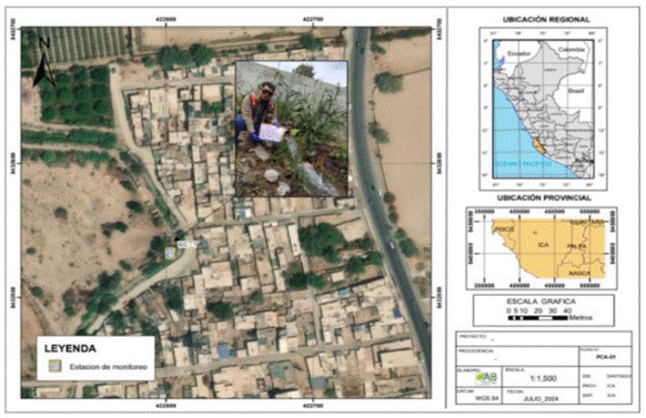 La identificación del punto de monitoreo para la evaluación de la calidad del agua subterránea se llevó a cabo mediante una inspección técnica in situ realizada el 03 de julio de 2024, con el objetivo de validar geográficamente la localización precisa del sitio de muestreo. Este procedimiento permitió asegurar la representatividad y accesibilidad del punto seleccionado. La recolección de la muestra se efectuó el mismo día, garantizando condiciones adecuadas para el análisis. En la Figura 1 se presenta la ubicación georeferenciadas de los puntos de monitoreo, mientras que en la Tabla 1 se detalla la coordenada UTM bajo el sistema de referencia WGS 84 zona 18 L.