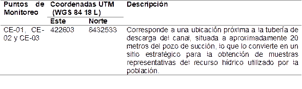 Tabla 1 Ubicación de los puntos de monitoreo de calidad del agua subterránea (Coordenadas UTM, WGS 84, Zona 18L)
