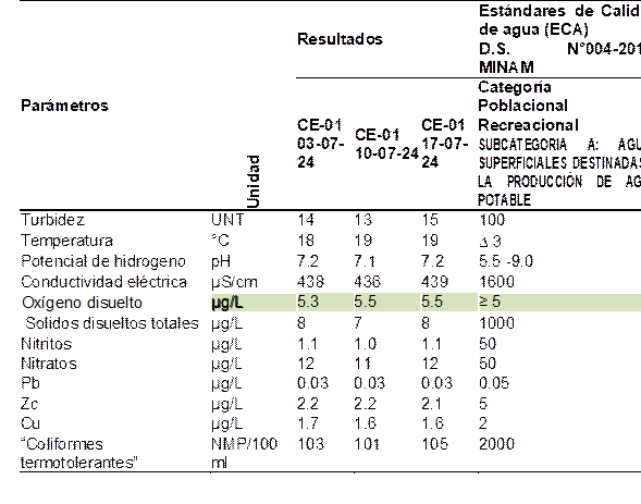 La evaluación de los parámetros fisicoquímicos y microbiológicos del agua para consumo humano en el Centro Poblado Santiago, Ica, responde a la necesidad de garantizar que este recurso cumpla con los estándares establecidos por el Decreto Supremo N°004-2017-MINAM. Dichos parámetros, entre los que destacan la turbidez, el pH, la conductividad eléctrica, los sólidos disueltos totales, los metales pesados (como plomo, zinc y cobre), así como la presencia de coliformes termotolerantes, permiten determinar la aptitud del agua para el consumo humano. El análisis de los puntos de monitoreo CE-01, CW-02 Y CE-003 realizado en tres fechas distintas, evidenció niveles de turbidez dentro del rango permitido por la norma (valores de 14, 13 y 15 UNT), lo cual sugiere una calidad aceptable del recurso. No obstante, debido a la importancia sanitaria de este parámetro, se procedió a aplicar una prueba estadística t-Student para evaluar si los valores observados difieren significativamente del límite máximo normativo (100 UNT).