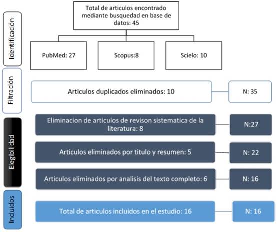 Siguiendo la metodología prisma de los 45 artículos se revisaron los duplicados, seleccionando 35 artículos, se eliminaron artículos de revisión sistemática, obteniendo 27 para el análisis. Después de aplicar los criterios de inclusión y exclusión, se asignaron 22 artículos para revisión detallada del texto completo, seleccionando 16 artículos para la extracción y análisis de datos. Ver Figura 1.