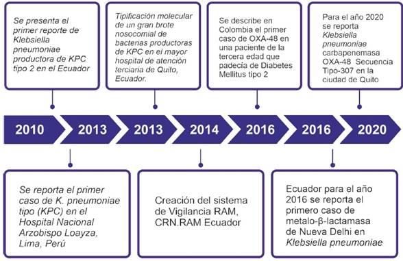 A continuación se detalla una línea de tiempo desde el 2010 como primer caso reportado en la ciudad de Quito de Klebsiella pneumoniae productora de KPC tipo 2, tres años más tarde, 2013, Perú reporta el primer caso de K. pneumoniae tipo (KPC) en el Hospital Nacional Arzobispo Loayza, para el mismo año en la ciudad de Quito se realiza una tipificación molecular de un gran brote nosocomial de bacterias productoras de KPC, con estos antecedes se decide la Creación del sistema de Vigilancia RAM de Ecuador. En el año 2016, Ecuador reporta el primer caso de metalo-β-lactamasa de Nueva Delhi en Klebsiella pneumoniae, y como último dato para el año 2020 reporta Klebsiella pneumoniae carbapenemasa OXA-48 Secuencia Tipo-307 en la ciudad de Quito. Ver Figura 2.