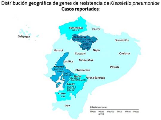 the evolution of Klebsiella pneumonia during the last twenty years highlights an exponential increase in the resistance genes KPC-2, NDM and OXA-48 distributed mainly in the cities of Quito, Guayaquil, Cuenca and Esmeralda. The KPC-2 gene is present in all cities that report antimicrobial resistance for K. pneumonia, therefore, it is the most prevalent gene in the country, causing greater failure of drug treatment.