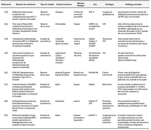 Cuatro de los estudios se realizaron la ciudad de Quito reportando los genes de resistencia blaKpc, blaKpc-2, blaVIM, blaIMP y blaOXA-48 el más reciente. Guayaquil por su parte reporta el gen de resistencia blaKpc ST 258, en la ciudad de Azogues reporta blaKpc-2, contrario a esto Esmeralda reporta el gen de resistenciaNDM-1 siendo la primera evidencia de tipo New Delhi metalobetalactamasa que albergada por un plásmido del grupo IncA/C aislado de un K. pneumoniae ST147. Ver Tabla 2.