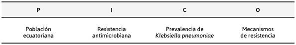 Se realizó una revisión sistemática de la literatura científica de estudios observacionales, de resistencia antimicrobiana en Klebsiella pneumoniae. Con base a la metodología PRISMA (Preferred Reportin Items for Systematic Reviews and Meta-Analyses 12. Se realizó una búsqueda bibliográfica de artículos originales y meta análisis en las bases de datos Medline (Pubmed), SciELO, Web of Science y Lilacs mediante los descriptores en Ciencias de la Salud (DeCS) y MesH (Medical Subject Headings): Klebsiella pneumoniae/ Klebsiella pneumoniae; resistencia a Antibióticos; /resistance to Antibiotics; farmacorresistencia bacteriana /bacterial drugresistanc, identificados tras la formulación de la pregunta PICO, y con la ayuda de los operadores booleanos OR/O y AND/Y.