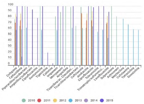 El Gráfico 1 permite verificar la tasa de variabilidad de los porcentajes de resistencia de la A. baumannii frente a los diferentes antibióticos durante el periodo 2010-2015. Se observa que la resistencia es variable, llegando a verificar resistencia algunos de ellos, incluyendo cefalosporinas y betalactàmicos.