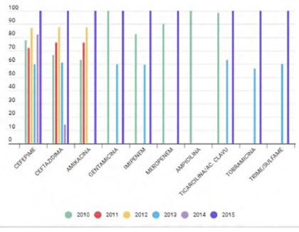 El Gráfico 2 demuestra la capacidad de la A. baumannii para adquirir resistencia a los diferentes antibióticos en los cinco años, alcanzando total resistencia con cefepime, ceftazidima, amikacina, gentamicina, imipenem, meropenem, ampicilna, ticarcilina-ácido clavulánico, tobramicina y trimetoprim sulfametoxazol.