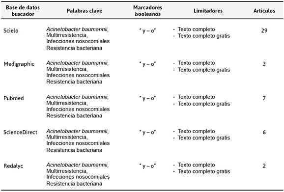 Para realizar la búsqueda de toda la información empleada en el artículo se utilizaron palabras clave como: infecciones nosocomiales, resistencia antimicrobiana, cultivos bacterias multirresistentes, bacterias nosocomiales, cultivos epidemiológicos, Acinetobacter baumannii, Acinetobacter multirresistente, Acinetobacter e infecciones intrahospitalarias, epidemiología Acinetobacter baumannii. Así como también se emplearon conectores booleanos como: y, o (and- or).