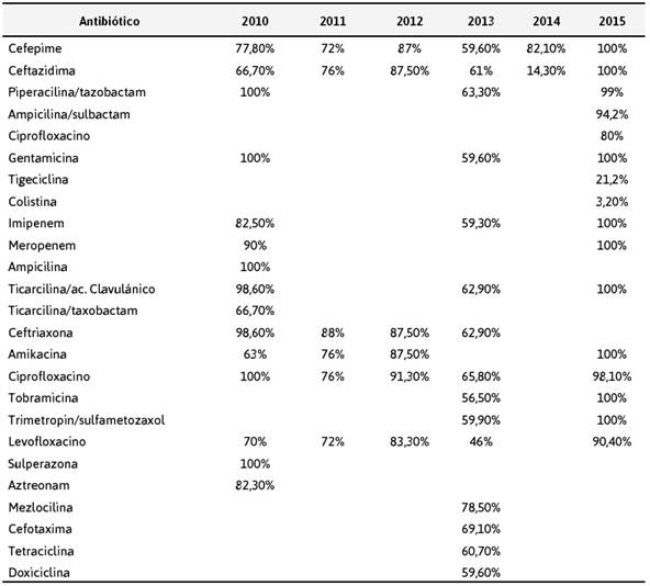Mediante la Tabla 5 se observa la resistencia de la A. baumannii frente a diferentes antibióticos, incluyendo β-lactámicos y cefalosporinas durante un periodo de tiempo de dos años a partir del 2010. En el mismo cuadro se observa la disminución en los porcentajes de sensibilidad frente a los mismos antibióticos durante la duración de la investigación.