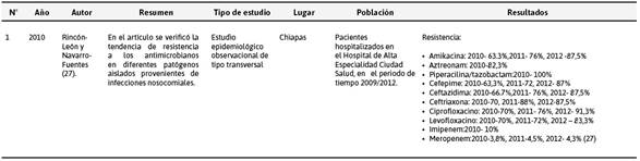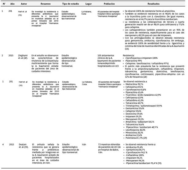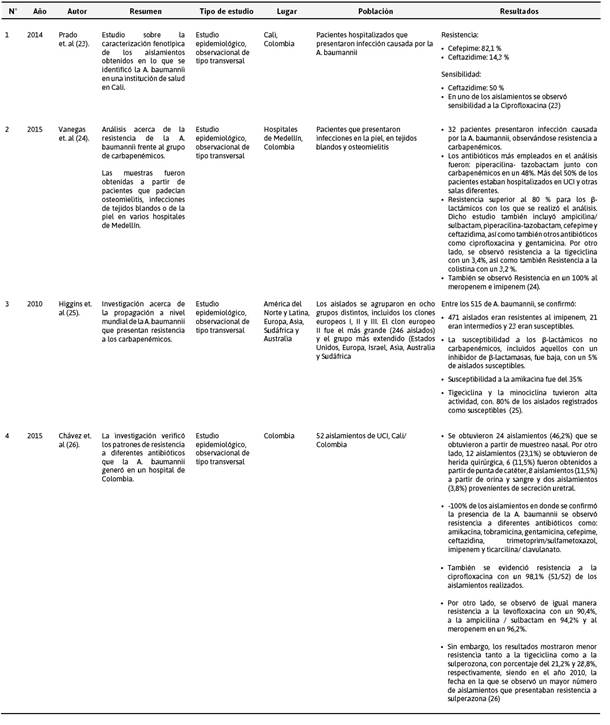 Los resultados obtenidos en la plataforma SciELo (Tabla 3) identificaron cuatro investigaciones, en su mayoría provenientes de Colombia, en donde se evidencia la resistencia de A. baumannii a los antibióticos de uso hospitalario, incluyendo los carbapenémicos.