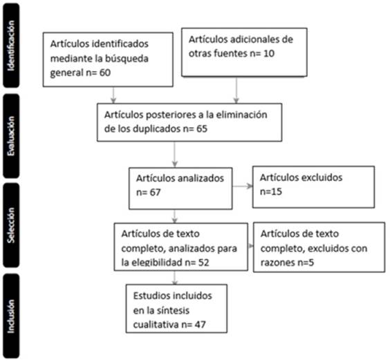 De la búsqueda en general se encontraron 60 artículos, de los cuales, cinco eran duplicados, los demás fueron analizados para en lo posterior descartar cinco más de acuerdo con los criterios de exclusión. Se culminó la revisión y selección de los artículos realizando una lectura completa de cada uno de ellos y se excluyeron cinco artículos por discrepancias en los métodos, en los resultados o en el estudio en general. Finalmente se realizó la revisión sistemática con los 47 artículos restantes.