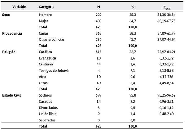 El 64,7% de la muestra (IC95% 60,19-67,73) corresponden al sexo femenino, 363 (58,3%; IC95% 54,09-61,79) proceden de la provincia de Cañar, 515 (82,7%; IC95% 78,97-84,91) manifestaron ser católicos, 597 (95.8% IC95% 93,25-96,62) participantes son solteros, los datos se muestran en la Tabla 1.