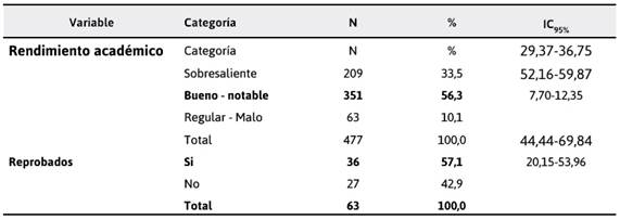 En cuanto al rendimiento académico, en la Tabla 2 se refleja que del total de participantes 63 (10,1% IC95% 7,70-12,35) reflejaron mal rendimiento de éstos 36 (57,1% IC95% 44,44-69,84) reprobaron el ciclo académico.