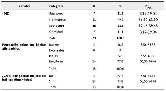 En cuanto al estado nutricional y percepción de hábitos de los estudiantes con bajo rendimiento como se muestra en la Tabla 3, 31 participantes (49,2% IC95% 36,50-61,90) presentaron normopeso, sin embargo, de los estudiantes que presentaron mal nutrición 18 (28,6% IC95% 17,46-39,68) se encontraron con sobrepeso, de estos el 77,8% reconocen que sus hábitos alimenticios no son los más adecuados, considerando que podrían mejorar dichos hábitos.