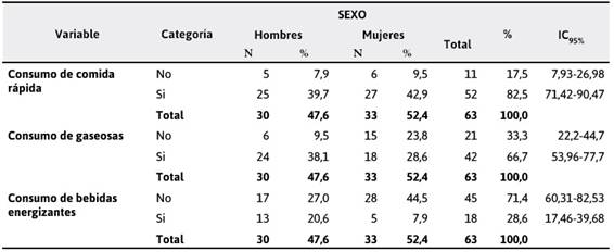De los 63 participantes con bajo rendimiento 52 (82,5% IC95% 71,42-90,47) manifestaron consumir comida rápida (papas fritas, hamburguesas, hot dogs, nachos, entre otros) consumiendo al menos dos veces a la semana, de los cuales el 42,9% corresponde al sexo femenino; de igual forma un gran porcentaje (66,7%) de estudiantes refirieron consumir bebidas gaseosas (colas) en este grupo en cambio, predominan los de sexo masculino con el 38,1%, los datos se evidencian en la Tabla 4, así también se demuestra que solo 18 (28,6% IC95% 17,46-39,68) estudiantes manifestaron consumir bebidas energizantes de estos la mayor proporción se encuentra en el sexo femenino.
