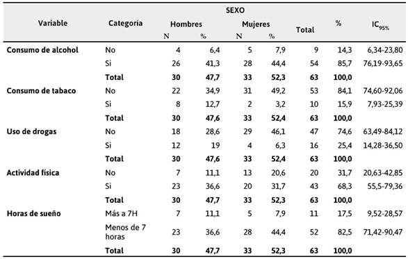 Los resultados obtenidos en cuanto a los hábitos nocivos, actividad física y horas de sueño que se reflejan en la Tabla 5, evidencian que 53 (85,7% IC95% 76,19-93,65) de los 63 estudiantes consumen alcohol, con proporciones muy similares entre hombres y mujeres, sin embargo, el consumo de tabaco no supera el 16%, existiendo un mayor predominio en el sexo masculino, en cambio el uso drogas supera el consumo de tabaco con un 25,4% (IC95% 14,28-36,50), de la misma manera superado en el sexo masculino. Solo el 31,7% (IC95% 20,63-42,85), de los estudiantes realizan algún tipo de actividad física, y el 82,5% (IC95% 71,42-90,47) manifestó tener menos de 7 horas de sueño diarias.