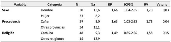 La correlación de variables demostró que el sexo masculino tiene 66% (RP 1,66; IC95% 1,04-2,65) más probabilidad de tener bajo rendimiento que el sexo femenino, mientras que los estudiantes que proceden de las distintas provincias del país tienen el 63% (RP 1,63; IC95% 1,03-2,63) más probabilidad de tener bajo rendimiento, que aquellos que proceden de la provincia del Cañar (Tabla 6). En cambio, la religión no tiene significancia en los estudiantes para tener un bajo rendimiento (RP 1,14; IC95% 0,38-1,17).