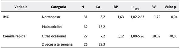En la Tabla 7 se evidencia que los estudiantes que presentaban malnutrición tienen 1,6 veces (RP 1,63; IC95% 1,02-2,63) más probabilidad de tener bajo rendimiento académico que aquellos estudiantes que tienen normopeso, así mismo los que consumen comida rápida por lo menos dos veces a la semana tienen 3,2 veces (RP 3,12; IC95% 1,88-5,26) más probabilidad de tener bajo rendimiento académico, en cuanto al consumo de bebidas gaseosas, energizantes, consumo de alcohol y tabaco no demostraron significancia alguna (RP 1,06; IC95% 0,64-1,75), (RP 1,23; IC95% 0,73-2,08), (RP 1,81; IC95% 0,90-3,57), (RP 1,06; IC95% 0,56-2,04) respectivamente.