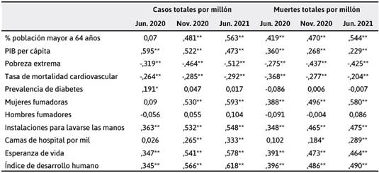Un total de siete variables presentaron correlación positivas débiles y moderadas con Infectados y Muerte por Covid-19: porcentaje de personas con edad igual o superior a los 65 años, el PIB per cápita, el porcentaje de mujeres fumadoras, la presencia de instalaciones para lavarse las manos, la cantidad de camas de hospital por mil habitantes, la esperanza de vida, así como el Índice de Desarrollo Humano (IDH). Se observaron correlaciones negativas significativas de baja fortaleza para Infectados y Muertes con la pobreza extrema de los países y la tasa de mortalidad cardiovascular. No se encontró correlación significativa de Infectados o Muertes con los fumadores masculinos y prevalencia de diabetes.