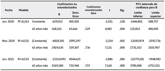 El número de Infectados/106 habitantes es modelado exclusivamente por la variable independiente porcentaje de la población con edad igual o mayor a 65 años en los tres cortes temporales realizados. El resto de las variables fueron excluidas por ser no significativas. El poder explicativo del modelo se fue incrementando para los diferentes momentos desde junio 2020, noviembre 2020 y junio 2021 al apreciarse un aumento del coeficiente de determinación (R2) de 0,263 hasta 0,563. El efecto de la variable independiente sugiere que por cada incremento del 1% en la proporción de la población con edad igual o mayor a 65 años se producen 5.269 nuevos Infectados/106 habitantes.