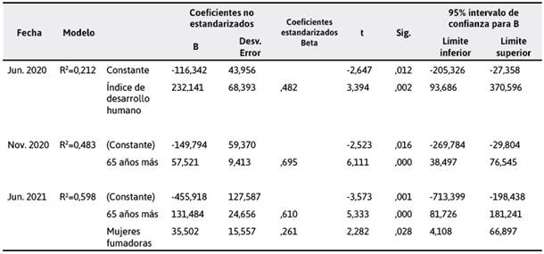 La Tabla 3 expone los resultados de los modelos de regresión lineal que explican las muertes/106 habitantes en las tres fechas estudiadas. En junio del 2020 se observó que la única variable incluida con significación estadística fue el IDH, con un poder explicativo bajo R2 (ajustado)= 0,212. Sin embargo, en noviembre del 2020, la variable explicativa del modelo fue la fracción de la población con 65 o más años con R2 (ajustado)= 0,470, mientras que en junio del año 2021 se advierten dos variables explicativas en el modelo: la fracción de la población con 65 o más años y el porcentaje de mujeres fumadoras del país, R2 (ajustado)= 0,598. Según este último modelo, por cada punto porcentual en la edad mayor a los 65 años se incrementa 131 muertes por Covid-19, así como, por cada punto porcentual en el número de mujeres fumadoras, se aumenta 35 muertes por Covid 19.