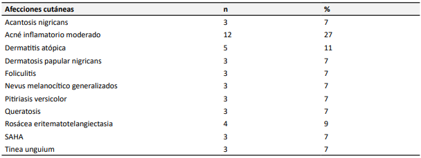 En la Tabla 1 se describen las distintas afecciones cutáneas diagnosticadas en los pacientes, en donde se puede observar que la patología más frecuente en el grupo de pacientes fue el acné inflamatorio, seguido de la dermatitis atópica y la rosácea.