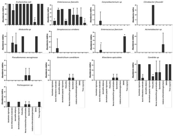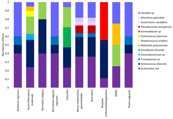 Una disminución significativa en el número de colonias de E. coli se relaciona con la presencia de signos clínicos relacionados a la rosácea y acné inflamatorio mientras que su abundancia se asoció a la presencia de patologías como acantosis nigicans, dermatitis atópica, dermatitis papular y queratosis. La acantosis nigricans y la dermatitis papular también se relacionaron con una disminución significativa de la bacteria Enterococcus feacalis. Se encontró un aumento en la proporción de Corynebacterium sp y de Streptococcus Viridans cuando los pacientes presentaban acné. Así, Citrobacter freundii y Klepsiella sp se presentaban en una mayor proporción en foliculitis.