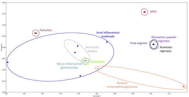 En este sentido, se puede observar que los pacientes con tinea, dermatosis y acantosis se asociaron a una composición microbiana similar. Los pacientes con saha y foliculitis se asociaron a perfiles microbianos característicos que los diferencian entre los demás grupos.
