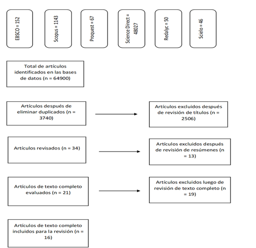 Este estudio comprendió 16 artículos de investigación, los mismos que cumplieron con los criterios de inclusión y exclusión establecidos, y que, obteniendo una valoración positiva en la estimación de su calidad; para esto último, se hizo uso de una tabla de criterios de evaluación de calidad. Por otra parte, estas investigaciones fueron obtenidas, a través de una búsqueda metódica en bases de datos científicas acreditadas; las empleadas para esta revisión fueron: Scopus, Science Direct, EBSCO, Proquest, Scielo y Redalyc.