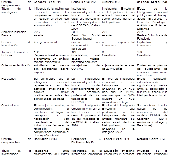12. Hencke M, Palomino A, Terrones J, Agama G. Inteligencia emocional y el clima laboral en el desarrollo profesional de los trabajadores de CORPAC, Callao 2020. Centro Sur. Social Science Journal. 2021. https://www.centrosureditorial.com/index.php/revista/article/view/110Links ]