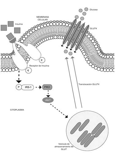 La regulación del transporte de glucosa por la insulina es esencial en la homeostasis, ya que la insulina promueve la translocación del transportador GLUT4 desde compartimentos intracelulares hacia la membrana plasmática, dependiendo de la activación de PI3K y la cinasa Akt. La insulina promueve la translocación del transportador GLUT4 desde el compartimento intracelular, hacia la membrana plasmática. Posterior a la secreción de insulina, esta se une a su receptor en la membrana celular activando la fosforilación del sustrato del receptor de insulina 1 (IRS-1), fosfoinositol-3-cinasa (PI3K) y proteína cinasa B (AKT) en cascada. Esto conduce a la translocación de GLUT4 que se encuentra almacenado en las vesículas de almacenamiento de GLUT en el citoplasma, permitiendo así la entrada de la glucosa a la célula (18) Figura 1.