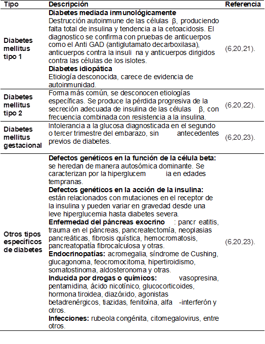 La diabetes mellitus (DM) es una condición metabólica que se caracteriza por la presencia crónica de hiperglucemia, acompañada de cambios en el metabolismo de carbohidratos, proteínas y lípidos. Las causas subyacentes y los factores desencadenantes de la DM pueden variar ampliamente, pero inevitablemente resultan en alteraciones en la secreción de insulina, en la acción de esta hormona, o ambas, en algún momento de su evolución (1,19). Existen varios tipos de diabetes y otras categorías de intolerancia a la glucosa Tabla 1.