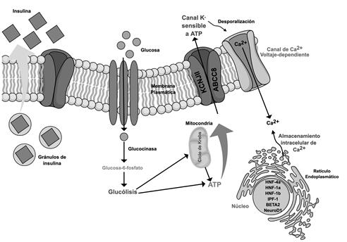 La MODY se asocia con las mutaciones en un conjunto de genes que codifican reguladores transcripcionales de las células ß pancreáticas. Algunos de los genes asociados con la MODY incluyen HNF1A, HNF4A, HNF1B, GCK y otros. Estas mutaciones afectan la producción de insulina, lo que puede provocar desequilibrios en la regulación de glucosa en sangre. La glucosa es transportada por la proteína GLUT-2 y la enzima glucocinasa (MODY 2) cataliza su conversión a glucosa-6-fosfato, actuando como el sensor de glucosa. La generación de ATP por el glucólisis y el ciclo de Krebs inhibe los canales de potasio sensibles al ATP, despolariza la membrana, activa los canales de calcio dependientes de voltaje, la entrada de calcio extracelular y la movilización de calcio de las reservas intracelulares, liberando insulina de los gránulos secretores. Las mutaciones en el gen de la glucocinasa reducen su actividad, disminuyendo la fosforilación de la glucosa y la liberación de insulina estimulada. Los factores de transcripción asociados a MODY (HNF-4a, HNF-1a, IPF-1, HNF-1b, NeuroD1, BETA2) funcionan en el núcleo de la célula y regulan la transcripción del gen de la insulina y otros relacionados con el transporte y metabolismo de la glucosa en las células beta (30-32) Figura 2.