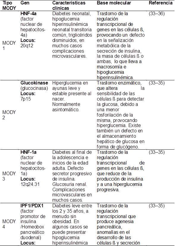 Los métodos moleculares para el diagnóstico de MODY se introdujeron después de la década de 1990. Se han informado mutaciones asociadas a MODY en al menos 14 genes diferentes, caracterizando 14 tipos de diabetes MODY con sus respectivas características clínicas y base molecular (30-32). Tabla 2.