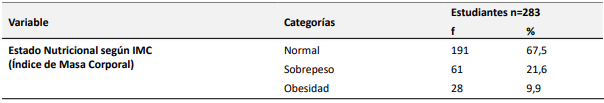 Los resultados revelaron que el mayor porcentaje de estudiantes se encuentra en un rango normal de IMC, los datos generales se describen en la Tabla 2.
