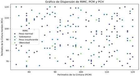 El análisis del Coeficiente V de Cramér indica una asociación débil o nula entre las categorías del IMC (RIMC) y el perímetro de cintura (PCM), lo que sugiere que el perímetro de cintura no predice categóricamente el IMC en esta muestra. Sin embargo, existe una ligera asociación entre el RIMC y el perímetro de cintura en hombres (PCH), aunque la relación no es fuerte. Estos hallazgos contradicen la noción general de que a mayor IMC, mayor perímetro de cintura y mayor riesgo para la salud, resaltando la importancia de analizar las variables de forma multifactorial Figura 1.