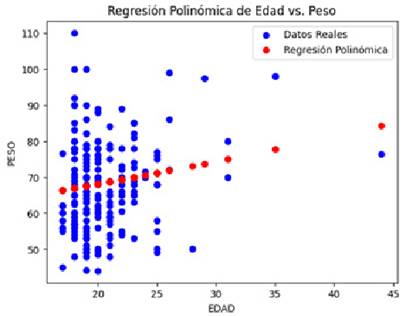 La regresión polinómica de edad versus peso muestra una relación no lineal, con un ligero aumento inicial en el peso con la edad hasta aproximadamente los 23 años, seguido de una fase estable y un posible segundo aumento cerca de los 45 años. No obstante, el ajuste del modelo no es perfecto, y la dispersión de los datos sugiere que otros factores además de la edad influyen en el peso. Además, el R-cuadrado negativo indica que el modelo no se ajusta bien a los datos y tiene un rendimiento peor que simplemente usar la media de los valores objetivo como predicción Figura 2.