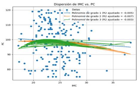 En la Figura 3, de dispersión entre el IMC y el perímetro de cintura muestra la distribución de los datos y los modelos polinómicos ajustados. La interpretación de este gráfico puede proporcionar información sobre la relación entre estas dos variables y cómo se ajustan los modelos no lineales a los datos.