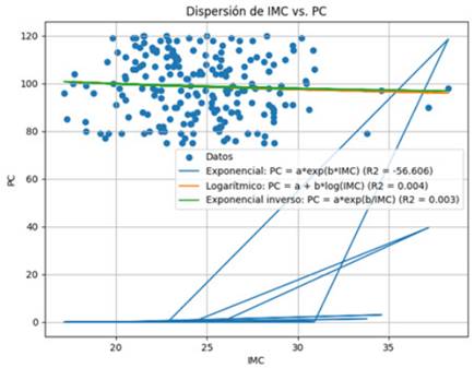Los modelos Figura 4, presentaron para el exponencial (R2 = -56.606), Logarítmico (R2 = 0.004) y exponencial inverso (R2 = 0.003) por lo que, el algoritmo de ajuste probablemente tuvo dificultades para converger a una solución razonable: Un R cuadrado muy cercano a 0 indica que el modelo logarítmico no explica la variabilidad en los datos, lo que sugiere que el IMC no tiene un efecto significativo en el PC según este modelo. Para el exponencial inverso muy similar al modelo logar logarítmico, lo que refuerza la conclusión de que este modelo no establece la relación significativa entre las variables. Ninguno de los modelos (exponencial, logarítmico o exponencial inverso) se ajusta bien a los datos: Los valores de R cuadrado extremadamente bajos o negativos lo confirman. De ahí que, no exista relación exponencial o logarítmica clara entre IMC y PC en estos datos: La dispersión de los puntos es demasiado grande y no sigue ninguna de las formas funcionales propuestas por estos modelos.
