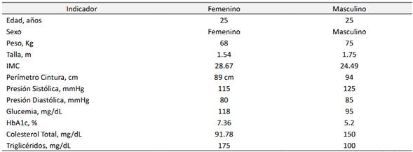 Para el perfil en la Tabla 1, la mujer, a pesar de ser más joven (25 años), presenta un perfil de salud metabólica más comprometido en comparación con el hombre de la misma edad. Esto se evidencia en su IMC (sobrepeso), glucemia elevada (prediabetes), HbA1c alta (diabetes) y triglicéridos en el límite superior. El hombre presenta un IMC dentro de rangos normales, pero tiene valores elevados en presión arterial y perímetro de cintura, lo que indica riesgo cardiovascular.