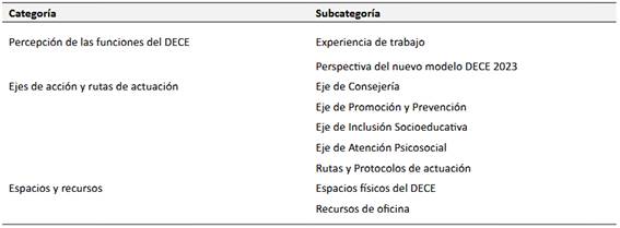 Como técnica principal, se utilizó la entrevista semiestructurada, la cual está constituida por 3 categorías y 9 subcategorías para realizar el respectivo análisis en función de los objetivos planteados en el estudio y de acuerdo al eje de investigación Tabla 1.