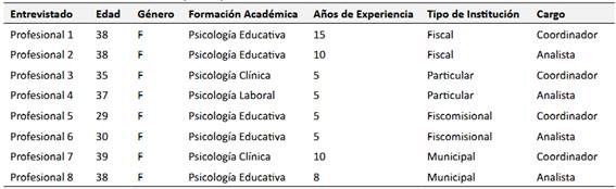 Para garantizar la representatividad de las voces profesionales, se implementó un muestreo no probabilístico por conveniencia, seleccionando participantes según su accesibilidad y cumplimiento de criterios de inclusión: (a) ejercer como psicólogo en un DECE durante al menos dos años, (b) pertenecer a instituciones de sostenimiento fiscal, particular, fiscomisional o municipal, y (c) residir en el Distrito Metropolitano de Quito. La muestra final incluyó a ocho psicólogas, cuyas edades oscilaron entre 29 y 39 años, con experiencia laboral de 5 a 15 años. Este perfil heterogéneo permitió contrastar realidades institucionales diversas, desde colegios urbanos con recursos limitados hasta instituciones privadas con infraestructura especializada.