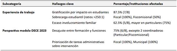 Por otro lado, la perspectiva del modelo DECE el 75% de las participantes identificó un desajuste entre su formación profesional y las funciones actuales, particularmente en instituciones fiscales y municipales, donde se priorizaron tareas administrativas sobre intervención directa. Las psicólogas educativas (60% del total) criticaron la reducción de roles pedagógicos, ahora delegados a pedagogos. Solo el 25% (coordinadoras de instituciones particulares y fiscomisionales) valoró el enfoque en problemas psicosociales del nuevo modelo. Por otro lado, el 50% señaló vacíos normativos, como la atención no reglamentada a necesidades educativas específicas, generando incertidumbre en la práctica diaria Tabla 3. Estas discrepancias reflejan una transición institucional conflictiva, marcada por la tensión entre expectativas profesionales y demandas administrativas.