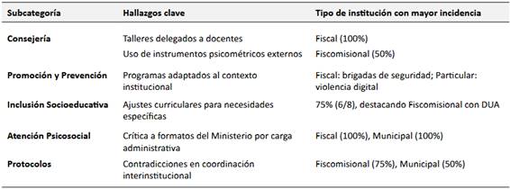 En tanto, al eje de promoción y prevención, todas las participantes implementan programas adaptados a su contexto institucional. En instituciones fiscales, destacan las brigadas de seguridad para prevenir riesgos externos, mientras las particulares enfocan esfuerzos en violencia digital y acoso escolar. Las fiscomisionales, aunque reportan baja incidencia de embarazos adolescentes, mantienen talleres preventivos proactivos. Estas diferencias reflejan respuestas contextualizadas: las fiscales priorizan seguridad física, los particulares riesgos socio-tecnológicos, y las fiscomisionales adoptan un enfoque preventivo integral, incluso ante problemáticas menos frecuentes Tabla 4.