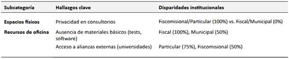 Las condiciones de infraestructura variaron significativamente según el sostenimiento institucional. Mientras las profesionales en instituciones fiscomisionales, particulares y municipales reportaron espacios privados y funcionales, las psicólogas en instituciones fiscales enfrentaron carencias críticas: ausencia de divisiones entre cubículos, mobiliario deteriorado y falta de privacidad durante las consultas. Estas limitaciones, descritas como "ambientes inseguros" por las entrevistadas, obstaculizaron la confidencialidad y la creación de un entorno de confianza con estudiantes y familias. La disparidad refleja una brecha estructural entre instituciones con financiamiento autónomo, que priorizan infraestructura adecuada, y aquellas dependientes de recursos estatales, donde las condiciones físicas no garantizan estándares básicos de atención psicosocial.