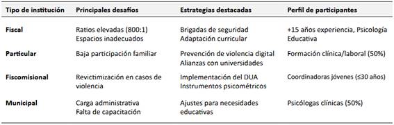 Por último, en las instituciones fiscales se enfrentaron ratios de hasta 800 estudiantes por profesional y espacios inadecuados. Implementaron brigadas de seguridad y adaptaciones curriculares básicas, lideradas por psicólogas educativas con más de 15 años de experiencia. En instituciones particulares se priorizaron la prevención de violencia digital y alianzas con universidades, aunque enfrentaron baja participación familiar. El 50% de sus profesionales tenían formación clínica o laboral, lo que influyó en un enfoque terapéutico.