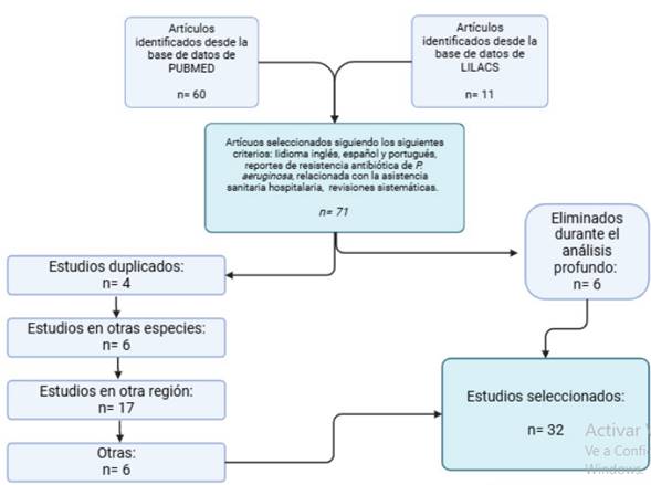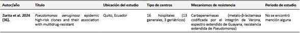 Siguiendo la metodología PCC la población (P. aeruginosa aislada en entornos clínicos), el concepto (evolución de los mecanismos de resistencia antimicrobiana), y el contexto, que abarca los entornos clínicos, el estudio se centró en entornos clínicos de América Latina. Tras la selección y análisis de los estudios, se incluyeron un total de 32 investigaciones relevantes para la revisión, las cuales muestran una amplia diversidad geográfica y de configuración hospitalaria en la región, Tabla 1.
